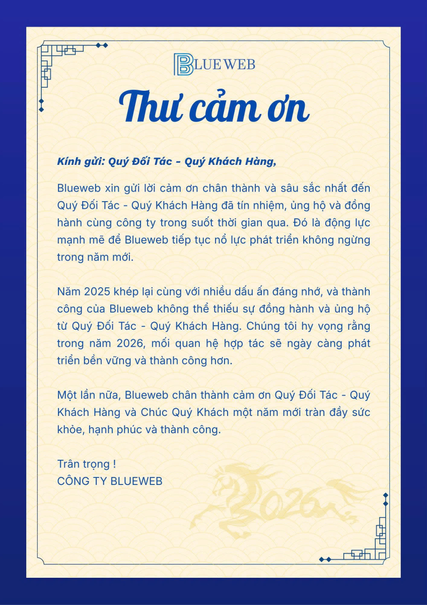 Một lần nữa Blueweb xin cảm ơn sự đồng hành, tin tưởng của Quý khách hàng trong thời gian vừa qua và rất mong sẽ được tiếp tục phục vụ Quý khách hàng trong thời gian sắp tới.